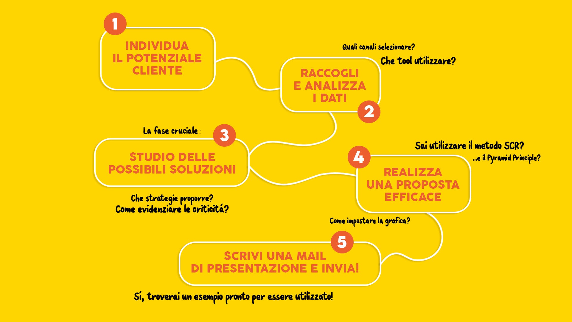 Mentre invece nella GUIDA PER ACQUISIRE NUOVI CLIENTI abbiamo messo insieme tutti gli step da seguire per presentarti e conquistare nuovi clienti: dall'analisi di partenza, fino alla realizzazione di una presentazione efficace e la scrittura della mail da inviare.